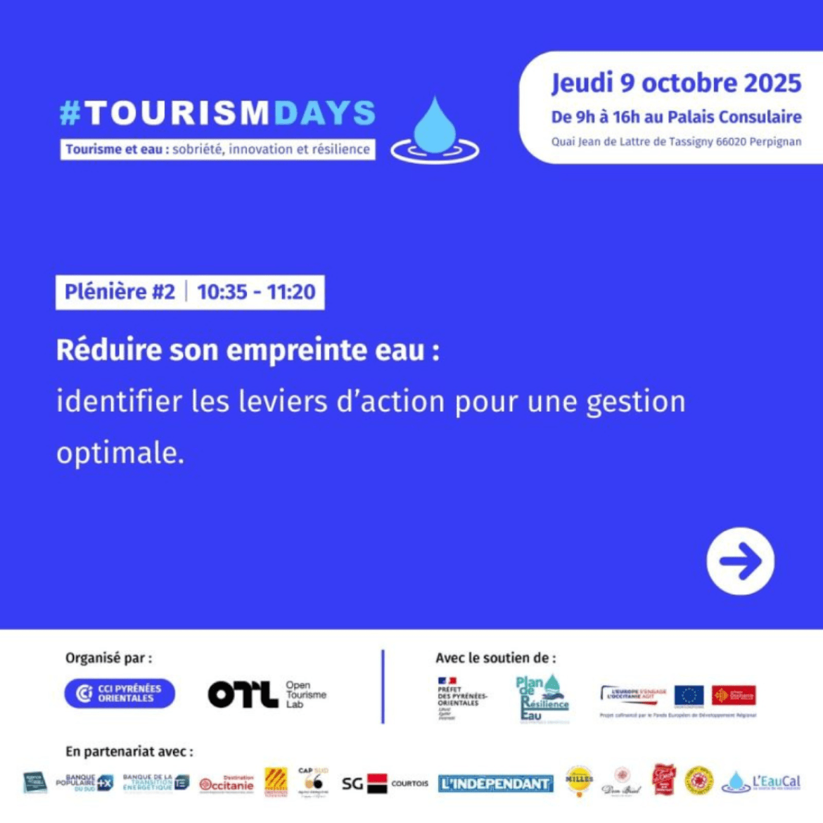 La CCIPO & Open Tourisme Lab s’associent pour organiser un #Tourismdays sur la thématique de l’eau : considérer les défis hydriques comme des catalyseurs d’évolution pour nos filières touristiques : anticiper, innover et mettre en œuvre des actions concrètes en faveur de la durabilité de nos activités.