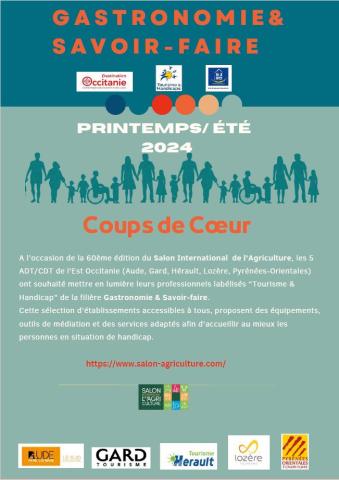 A l’occasion de la 60ème édition du Salon International de l’Agriculture, les 5 ADT/CDT de l'Est Occitanie (Aude, Gard, Hérault, Lozère, Pyrénées-Orientales) ont souhaité mettre en lumière leurs professionnels labélisés “Tourisme & Handicap” de la filière Gastronomie & Savoir-faire. Cette sélection d’établissements accessiblesà tous, proposent des équipements, outils de médiation et des services adaptés afin d'accueillir au mieux les personnes en situation de handicap.